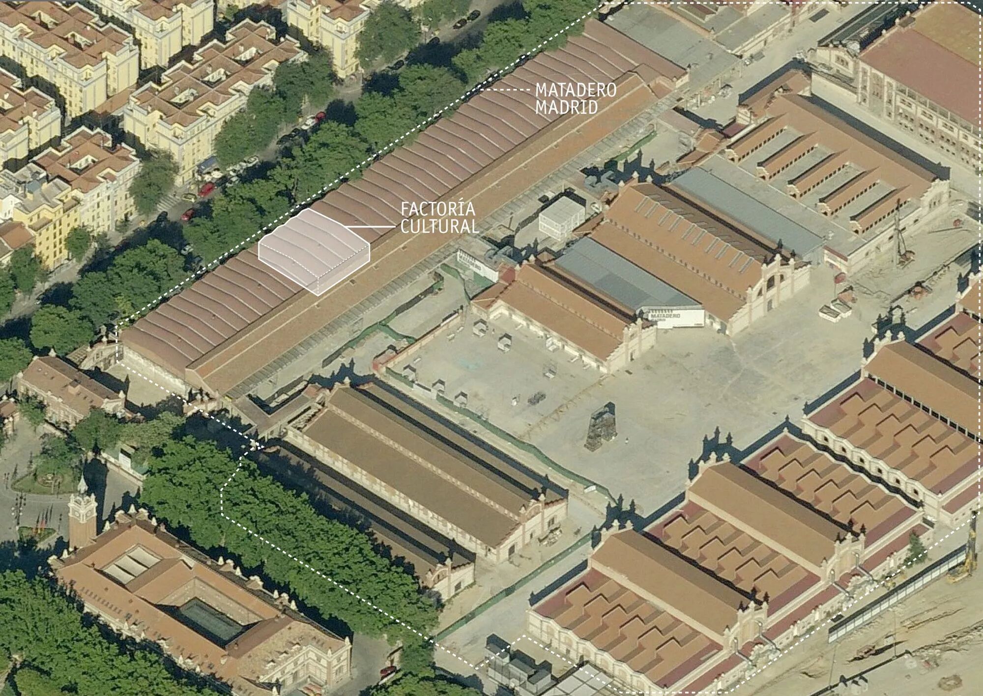 西班牙马德里屠宰场文化工场(Factoría Cultural in Matadero Madrid,以下简称“FCMM”)便是这样一个改建而成的艺文特区项目。FCMM改建自马德里的一个中型礼堂,以容纳文化产业的孵化器。