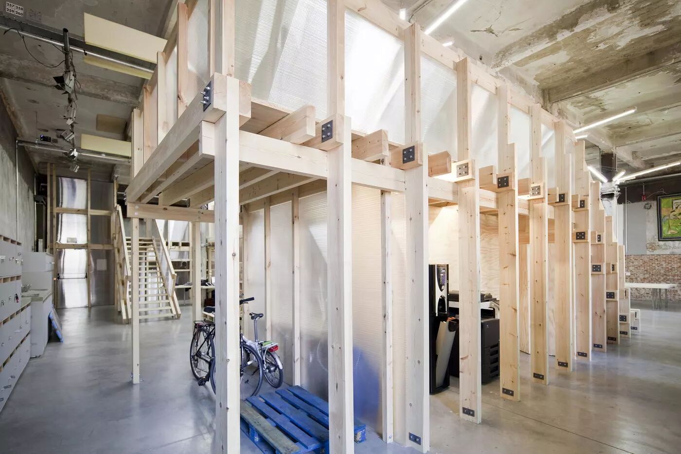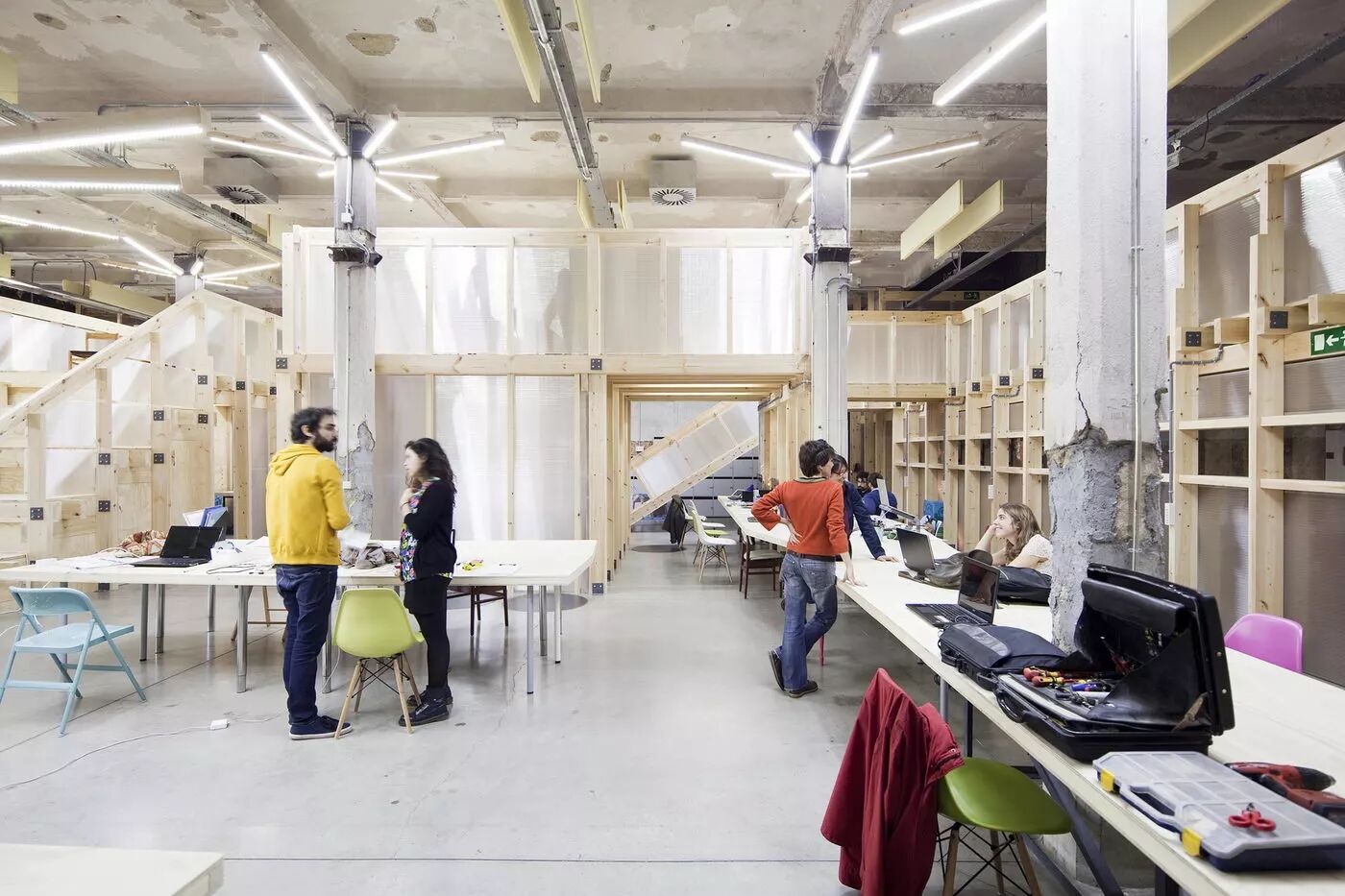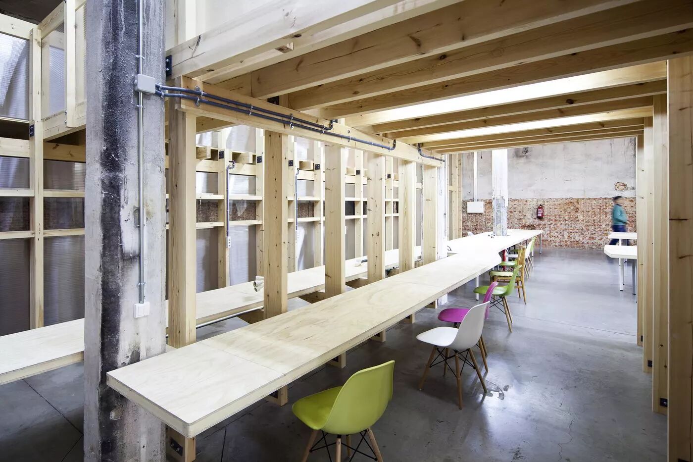 空间入口处的三个体块主导了整体空间,它周围的流线被折叠和压缩,由此给使用者带来了从紧凑到开阔、从热闹到安静的节奏变化,这完全符合工作空间的灵活性和多样性。除了公共交通面积以外,最终的建筑使用面积仅为340平方米,但却需要容纳120个工作单元。因此,设计师只能从空间高度上来寻找新的可能。主案建筑师Angel Borrego Cubero使用了当地最廉价的松木来实现空间中非传统的二层空间,来赢得了额外的85平方米。
