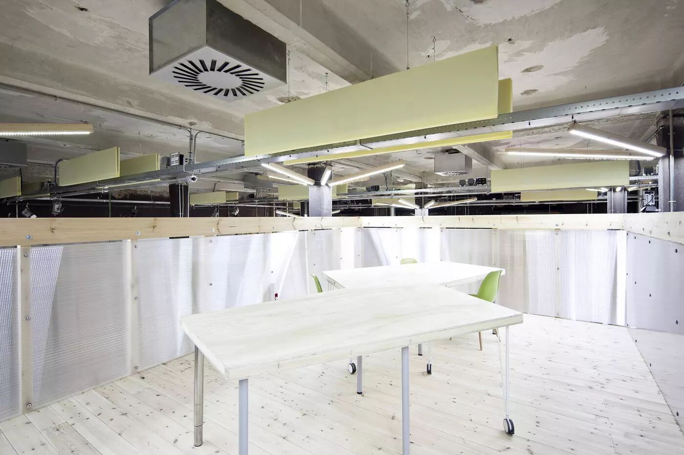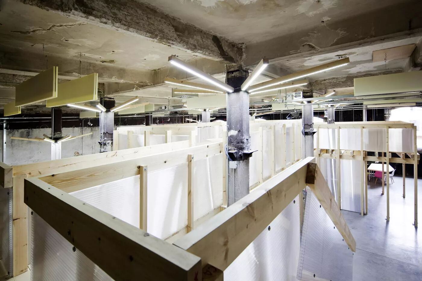 与以往的空间设计不同的是,FCMM看起来似乎是一个未完成的办公环境,这同样有助于激发工作者的创造性。空间中还有很多颇具趣味性的小细节,例如,灯具被装在位于楼板和扶手间的竖向木构件的凹槽里和一个十分简单的吸音系统改善的声环境。这个项目不仅持续性十足,更在经济和环保问题上做了最周全的考虑。