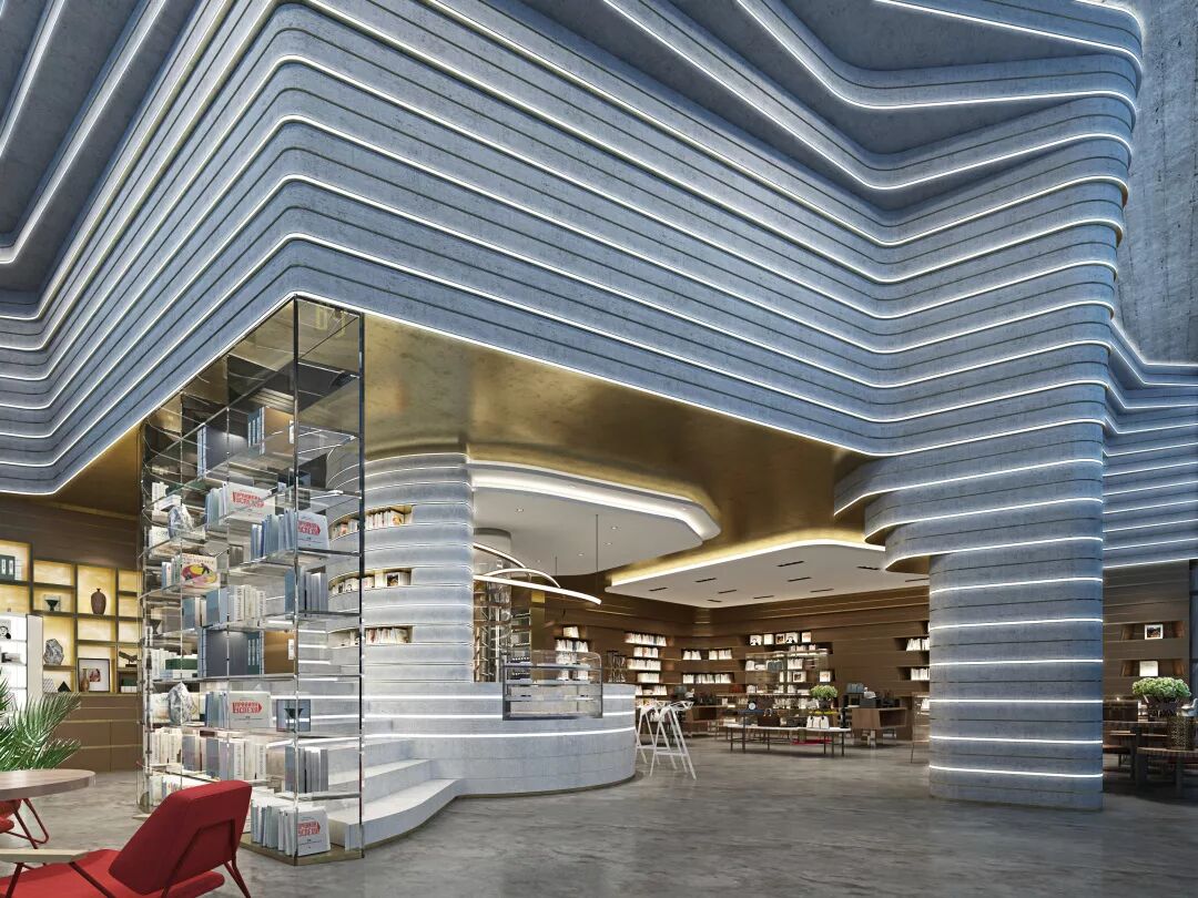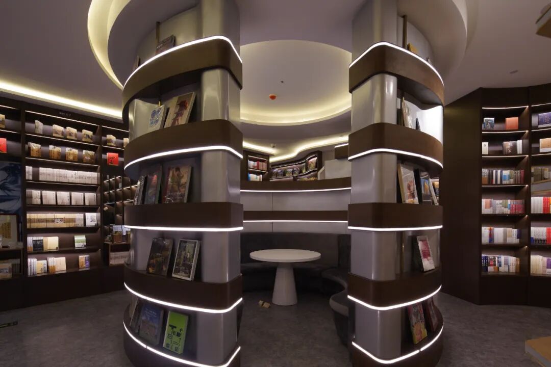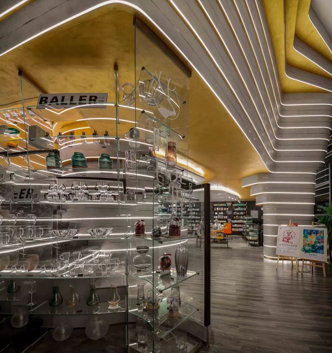 镂空层叠圆柱的设计贯穿整个书店,配以柔色灯光,让整体空间如晨间的山林,实在让人忍不住深入探索一番,好似冥冥中指引你去发现宝藏。