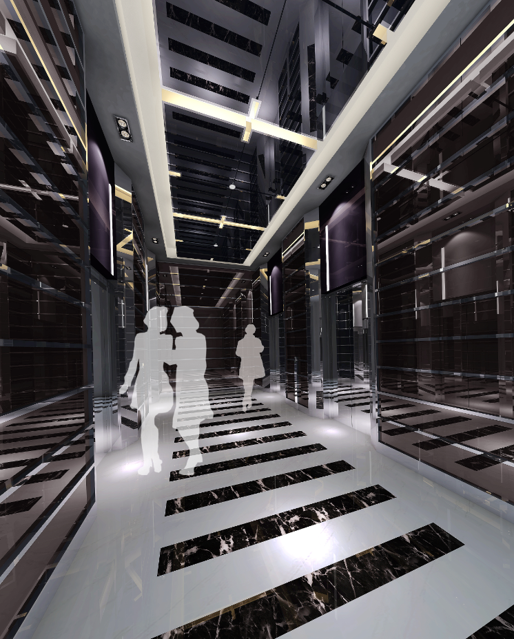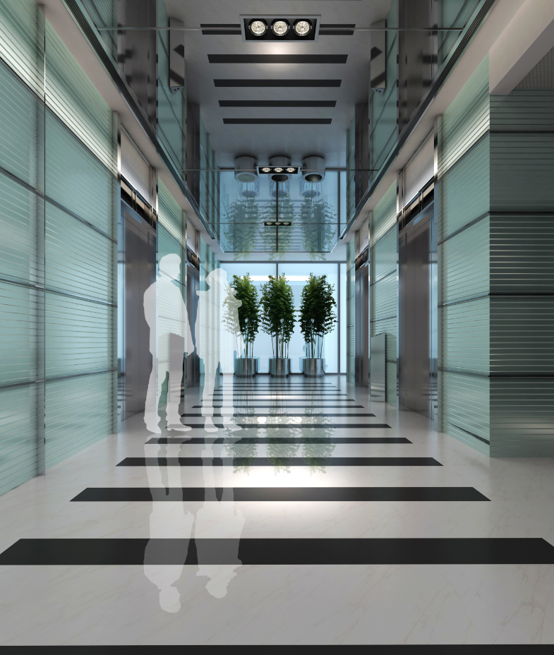 办公室公共走道以白色为主基调,一侧为白色烤漆玻璃,另一侧将外立面图刻印在烤漆玻璃面上,内部打光后线条清晰的展现出来,塑造出未来感。