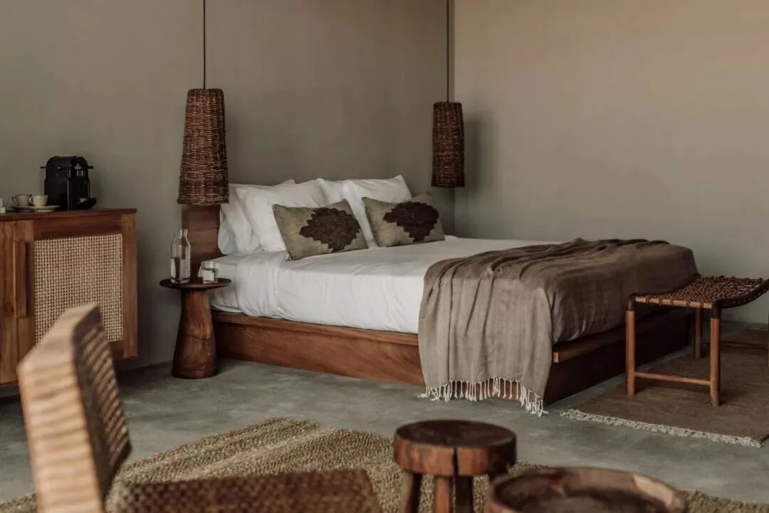 从标准房到别墅的各种房间,都给人一种古朴而又私密的感觉,就像一个家外之家。每间客房均设有自己的私人露台,而优质的屋顶露台房间拥有广阔的日落美景。橙色和红色的阴影抵消了绿色和蓝色的暗色调,而原始的木制家具和失去光泽的陶瓷则营造出一种被削减的奢华感。