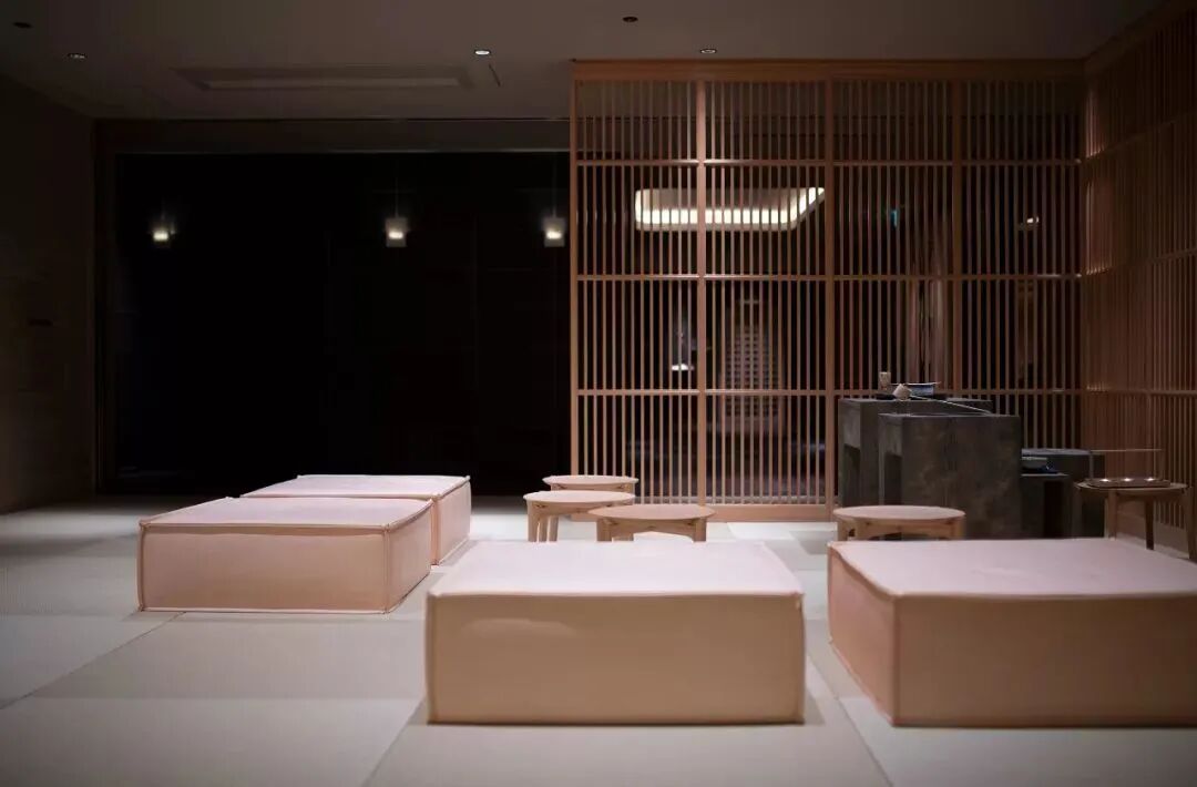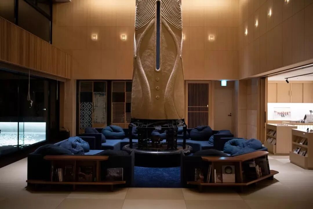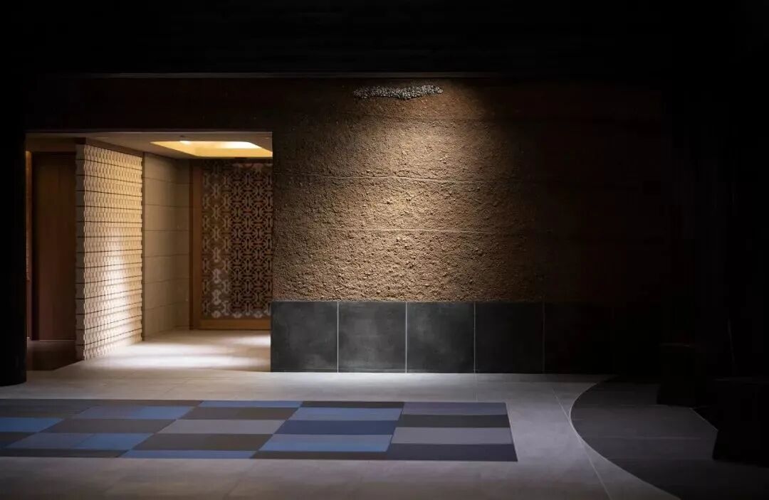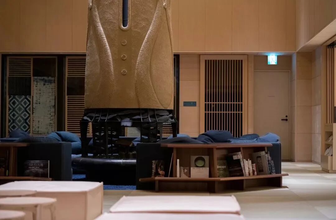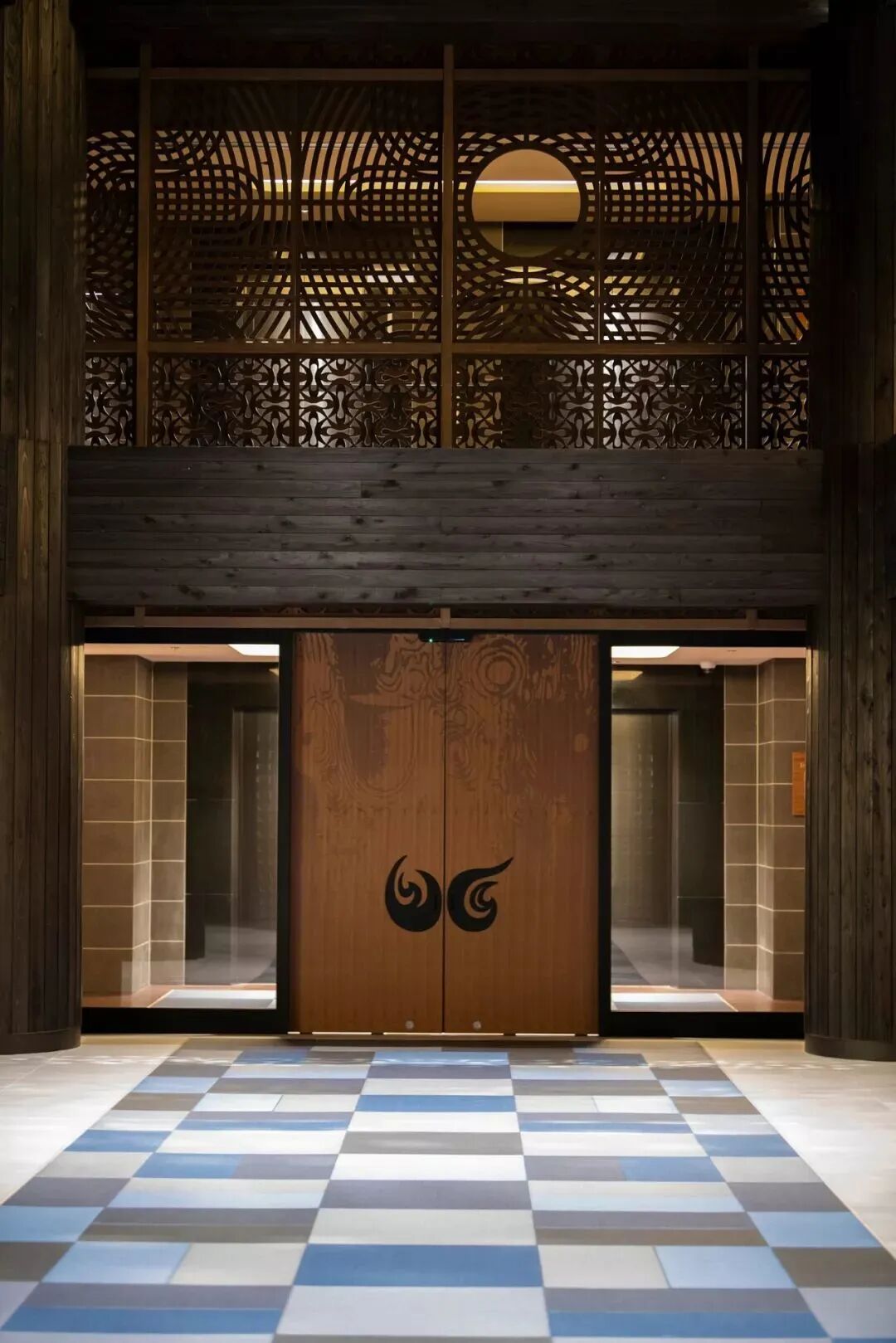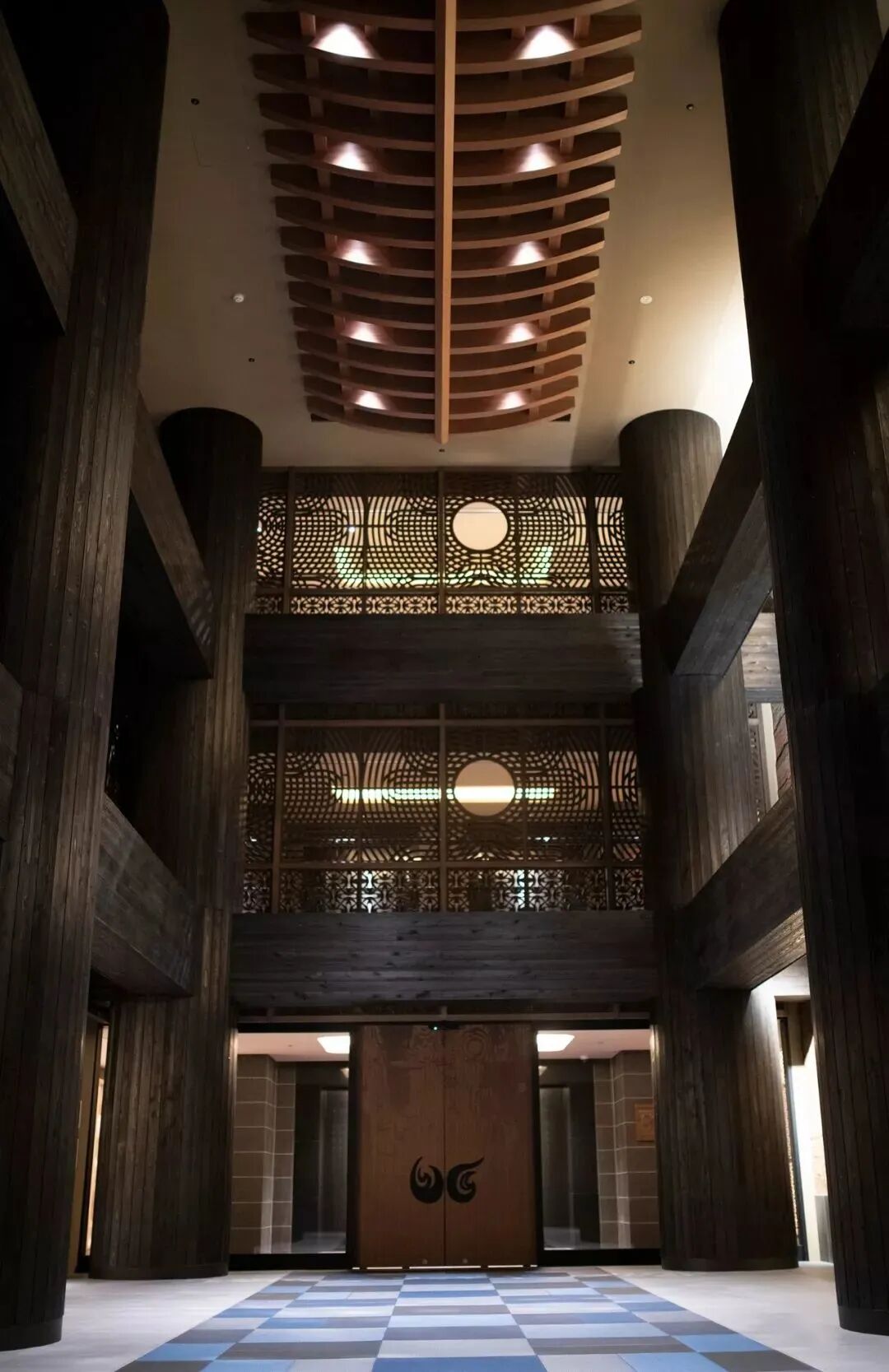 △ 传统与当代融合的酒店大堂 酒店保留日式旅馆进门拖鞋的传统,感受回家般的温暖,这个细节非常重要,在采访东利惠时,她也跟我们强调这一点。碧之座的大堂设计使用了大量的木雕,黑色的大柱给人强烈的视觉震撼,不同颜色拼接的榻榻,柔软舒适。