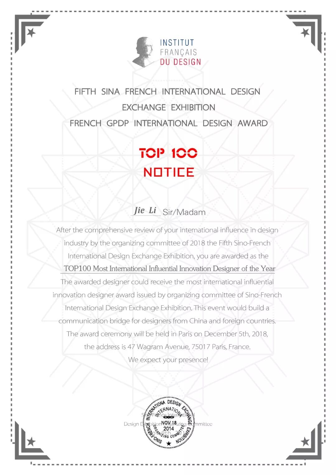 2018第五届法国双面神“GPDP AWARD”国际设计大奖颁奖盛典于2018年12月5日在在法国巴黎瓦格兰大街设计艺术中心隆重举行。